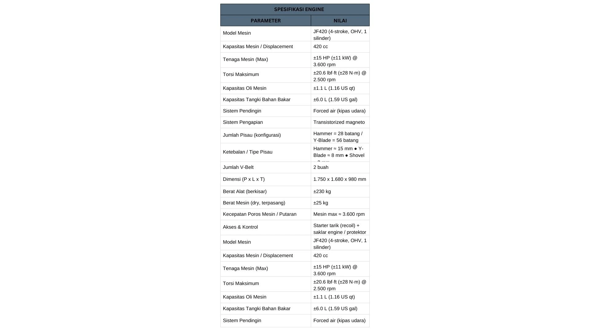 Flail Mower ATV120A dilengkapi mesin bensin 4-tak berkapasitas 420 cc yang mampu menghasilkan tenaga hingga 15 HP dengan torsi maksimal ±28 Nm pada putaran rendah. Mesin ini dirancang tangguh untuk bekerja di medan berat, namun tetap efisien dengan konsumsi bahan bakar sekitar 0,5 liter/jam per HP.
