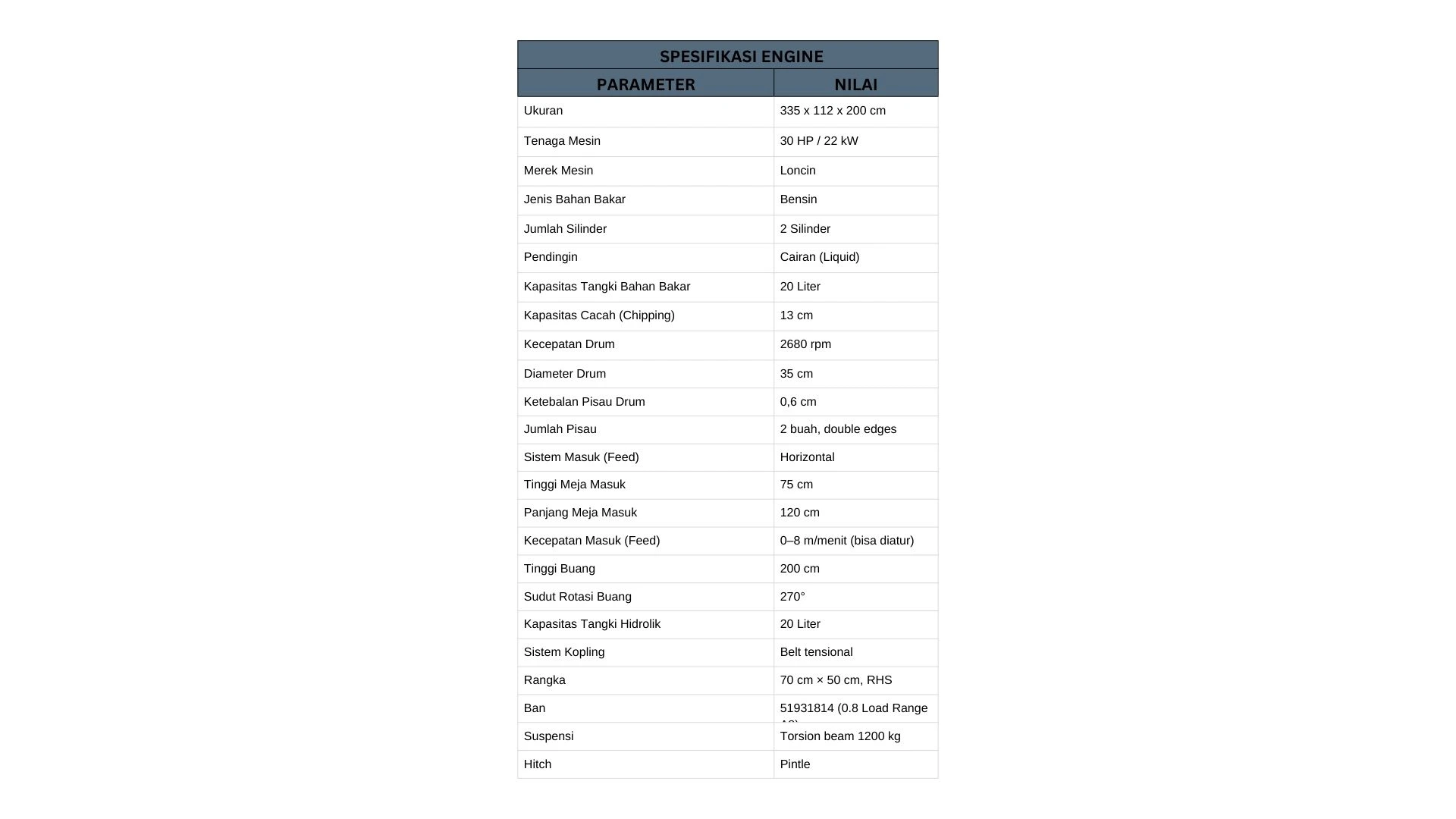 Ditenagai mesin bensin Loncin 2 silinder berpendingin cairan dengan tenaga 30 HP, Wood Chipper Heavy Duty siap menghancurkan kayu berdiameter hingga 13 cm. Dengan kecepatan drum 2680 rpm dan pisau ganda yang tajam, proses pencacahan menjadi lebih cepat, rapi, dan efisien.